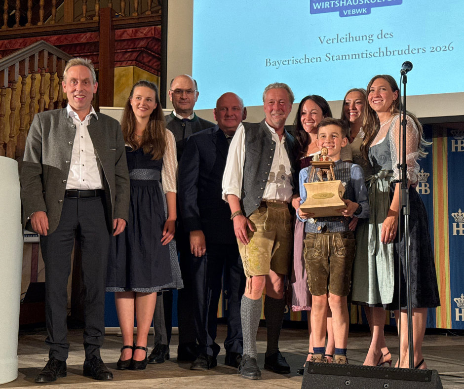 Der VEBWK hat am Montagabend im großen Festsaal des Münchner Hofbräuhauses den „Bayerischen Stammtischbruder 2026“ verliehen. Die bereits zum 13. Mal vergebene Auszeichnung geht in diesem Jahr an Lorenz Hilger, Wirt des Gasthofs Hirzinger in Riedering im Landkreis Rosenheim. Die Laudatio auf den Preisträger hielt der Bayerische Staatsminister für Finanzen und Heimat, Albert Füracker.